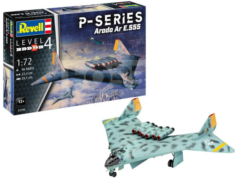 Revell P-Series Arado AR E. 555 1:72 repülő makett 03790R Makett méretarány: 1:72 Alkatrész darabszám: 98 Makett hossúság: 22 cm Festést és ragasztást igénylő műanyag makett. A szükséges kiegészítőket, mint festék, ragasztó a készlet nem tartalmazza . Gyártó: Revell A Revell tradicionális nagy múltú makett gyártó. Már több mint 60 éve kápráztatja el a rajongóit t