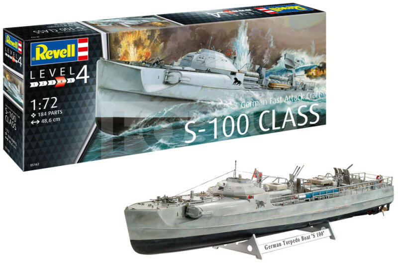 Revell German Fast Attack Craft S-100 1:72 hajó makett 05162R Makett méretarány: 1:72 Alkatrész darabszám: 184 Makett hossúság: 48,6 cm Festést és ragasztást igénylő műanyag makett. A szükséges kiegészítőket, mint festék, ragasztó a készlet nem tartalmazza . Gyártó: Revell A Revell tradicionális nagy múltú makett gyártó. Már több mint 60 éve kápráztatja el a rajong