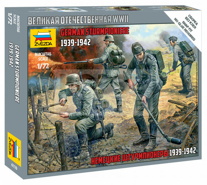 Zvezda German Sturmpioniere 1939-1942 makett 1:72 (6110Z) Makett méretarány: 1:72 Alkatrész darabszám: 22 Makett hosszúsága: 2,4 cm A Zvezda a kiváló műanyag modelljei kapcsán vált világszerte ismerté. Makettei a legnépszerűbb méretarányokban érhető el. Elsősorban 2. világháborús gépezetek és kiegészítőik kapcsán érdemes megemlíteni a nevét, de a történelmi makett