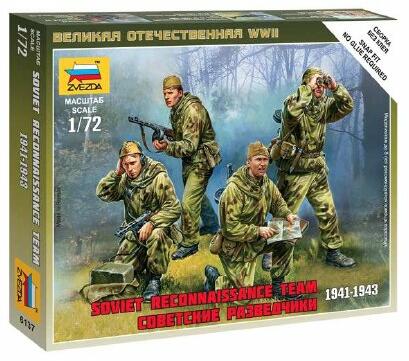Festést, ragasztást igénylő makett. Szovjet felderítő csapat 1941-1943 Méretarány: 1:72 Gyártó: Zvezda