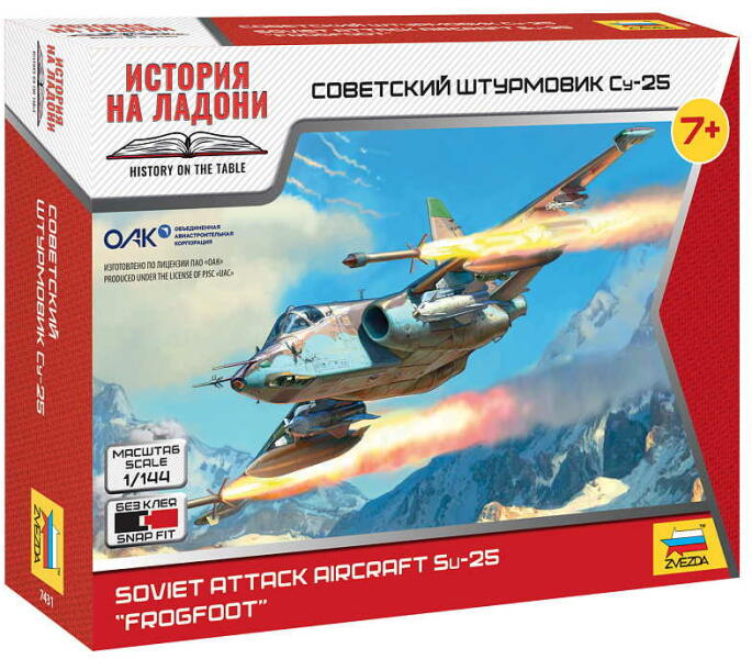 Ragasztást nem igénylő makett. A Szu-25 (NATO-kódolás: Frogfoot) egy együléses, páncélozott szubszonikus, erősen felfegyverzett és hihetetlenül túlélőképes szovjet támadó repülőgép. Arra tervezték, hogy a szárazföldi erők támogatására szolgáljon a harctéren nappal és éjszaka, egyszerű és nehéz időjárási körülmények között, a célpont vizuális láthatós