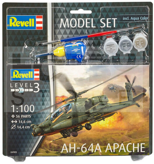Revell Model Set AH-64A Apache 1:100 repülő makett 64985R Makett méretarány: 1:100 Alkatrész darabszám: 56 Makett hossúság: 14,6 cm Festést és ragasztást igénylő műanyag makett. A készlet az alap színeket (Revell Aqua Color), ragasztót illetve ecsetet tartalmaz . Gyártó: Revell A Revell tradicionális nagy múltú makett gyártó. Már több mint 60 éve kápráztatja el a rajon