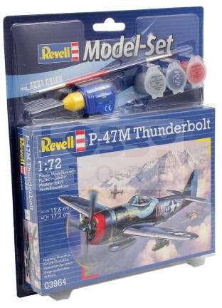 Revell Model Set P-47 M Thunderbolt 1:72 repülő makett 63984R Makett méretarány: 1:72 Alkatrész darabszám: 67 Makett hossúság: 15,6 cm Festést és ragasztást igénylő műanyag makett. A készlet az alap színeket (Revell Aqua Color), ragasztót illetve ecsetet tartalmaz . Gyártó: Revell A Revell tradicionális nagy múltú makett gyártó. Már több mint 60 éve kápráztatja el a ra