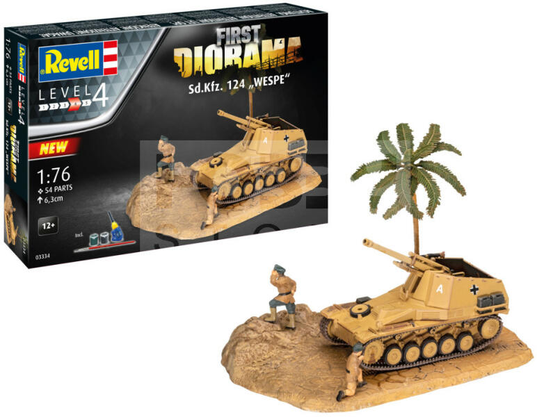 Revell First Diorama Set - Sd. Kfz. 124 Wespe 1:76 harcjármű makett 03334R Makett méretarány: 1:76 Alkatrész darabszám: 54 Makett hossúság: 6,3 cm Festést és ragasztást igénylő műanyag makett. A szükséges kiegészítőket, mint festék, ragasztó a készlet nem tartalmazza . Gyártó: Revell A Revell tradicionális nagy múltú makett gyártó. Már több mint 60 éve kápráztatja