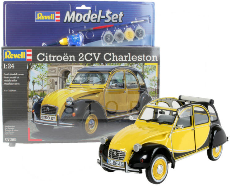 Revell Model Set Citroën 2CV Charleston 1:24 autó makett 67095R Makett méretarány: 1:24 Alkatrész darabszám: 126 Makett hossúság: 16 cm Festést és ragasztást igénylő műanyag makett. A készlet az alap színeket (Revell Aqua Color), ragasztót illetve ecsetet tartalmaz . Gyártó: Revell A Revell tradicionális nagy múltú makett gyártó. Már több mint 60 éve kápráztatja el a r