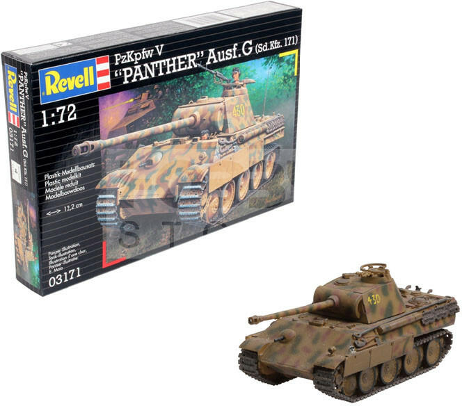 Revell - PzKpfw V. Panther Ausf. G (Sd. Kfz. 171) 1:72 harcjármű makett 03171R Makett méretarány: 1:72 Alkatrész darabszám: 124 Makett hossúság: 12,2 cm Festést és ragasztást igénylő műanyag makett. A szükséges kiegészítőket, mint festék, ragasztó a készlet nem tartalmazza . Gyártó: Revell A Revell tradicionális nagy múltú makett gyártó. Már több mint 60 éve káprá