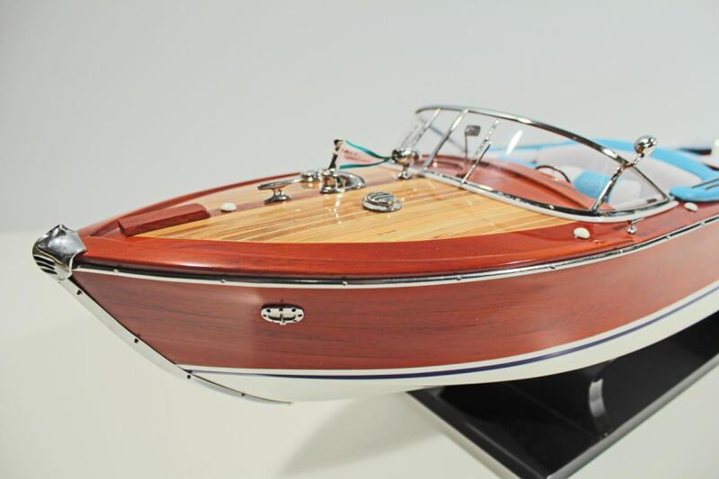 Riva Aquarama motorcsónak makett 52cm MÉRETE: 52 × 18 × 17 magas cm ANYAGA: prémium minőségű mahagóniból készült hajótest, bőr ülések, króm kiegészítők TARTOZÉKOK: a motorcsónak tömör fából készült talpazaton fekszik. A talpazatnak köszönhetően könnyen elhelyezhető a bútoron. CSOMAGOLÁS: a makettet összeszerelve, biztonságos fa védőkeretben és dobozban forga