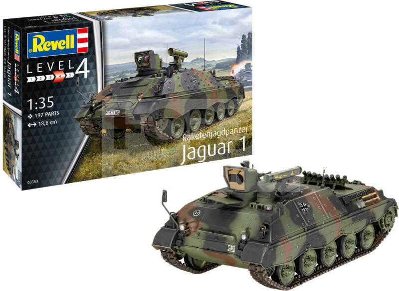 Revell Raketenjagdpanzer Jaguar 1 1:35 harcjármű makett 03353R Makett méretarány: 1:35 Alkatrész darabszám: 197 Makett hossúság: 18,8 cm Festést és ragasztást igénylő műanyag makett. A készlet az alap színeket (Revell Aqua Color), ragasztót illetve ecsetet nem tartalmaz . Fedezd fel a legendás Jaguar 1 rakétaromboló modellkészletét, a hadtörténelem figyelemre méltó darabj
