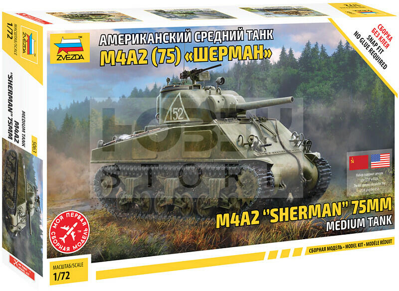 Zvezda M4 A2 (75mm) Sherman Medium Tank makett 1:72 (5063Z) Makett méretarány: 1:72 Alkatrész darabszám: 120 Makett hosszúsága: 9 cm A Zvezda a kiváló műanyag modelljei kapcsán vált világszerte ismerté. Makettei a legnépszerűbb méretarányokban érhető el. Elsősorban 2. világháborús gépezetek és kiegészítőik kapcsán érdemes megemlíteni a nevét, de a történelmi maket