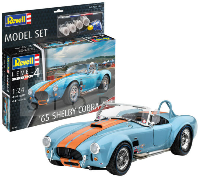 Revell Model Set 65 Shelby Cobra 427 1:24 autó makett 67708R Makett méretarány: 1:24 Alkatrész darabszám: 93 Makett hossúság: 16,8 cm Festést és ragasztást igénylő műanyag makett. A készlet az alap színeket (Revell Aqua Color), ragasztót illetve ecsetet tartalmaz . Gyártó: Revell A Revell tradicionális nagy múltú makett gyártó. Már több mint 60 éve kápráztatja el a rajo