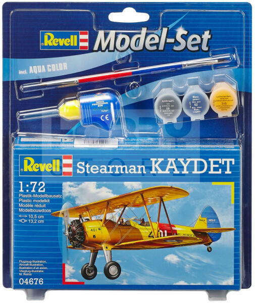 Revell Model Set Stearman Kaydet 1:72 repülő makett 64676R Makett méretarány: 1:72 Alkatrész darabszám: 29 Makett hossúság: 10,5 cm Festést és ragasztást igénylő műanyag makett. A készlet az alap színeket (Revell Aqua Color), ragasztót illetve ecsetet tartalmaz . Gyártó: Revell A Revell tradicionális nagy múltú makett gyártó. Már több mint 60 éve kápráztatja el a rajon