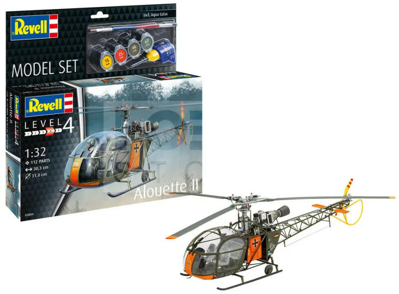 Revell Model Set Alouette II 1:32 helikopter makett 63804R Makett méretarány: 1:32 Alkatrész darabszám: 191 Makett hossúság: darab30,3 cm Festést és ragasztást igénylő műanyag makett. A készlet az alap színeket (Revell Aqua Color), ragasztót illetve ecsetet tartalmaz . Gyártó: Revell A Revell tradicionális nagy múltú makett gyártó. Már több mint 60 éve kápráztatja el a r