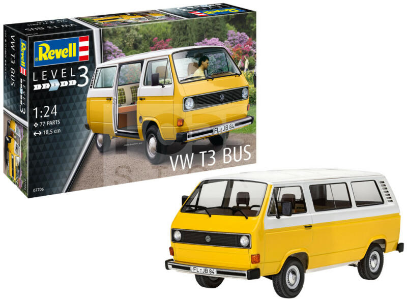 Revell VW T3 Bus 1:25 autó makett 07706R Makett méretarány: 1:25 Alkatrész darabszám: 77 Makett hossúság: 18,5 cm Festést és ragasztást igénylő műanyag makett. A szükséges kiegészítőket, mint festék, ragasztó a készlet nem tartalmazza . Gyártó: Revell A Revell tradicionális nagy múltú makett gyártó. Már több mint 60 éve kápráztatja el a rajongóit termékeivel. Sz