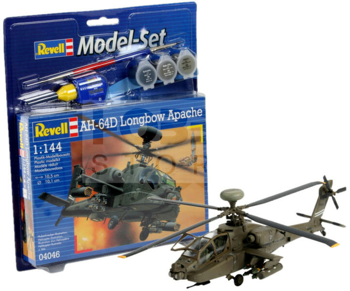 Revell Model Set - AH-64D Longbow Apache 1:144 helikopter makett 64046R Makett méretarány: 1:144 Alkatrész darabszám: 79 Makett hossúság: 10,5 cm Festést és ragasztást igénylő műanyag makett. A készlet az alap színeket (Revell Aqua Color), ragasztót illetve ecsetet tartalmaz . Gyártó: Revell A Revell tradicionális nagy múltú makett gyártó. Már több mint 60 éve kápráztatj