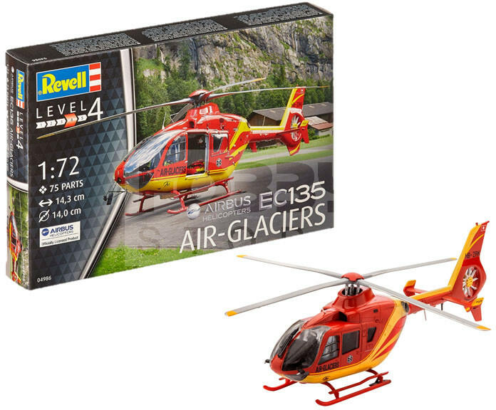 Revell EC135 Air-Glaciers 1:72 helikopter makett 04986R Makett méretarány: 1:72 Alkatrész darabszám: 75 Makett hossúság: 14,3 cm Festést és ragasztást igénylő műanyag makett. A szükséges kiegészítőket, mint festék, ragasztó a készlet nem tartalmazza . Gyártó: Revell A Revell tradicionális nagy múltú makett gyártó. Már több mint 60 éve kápráztatja el a rajongóit ter