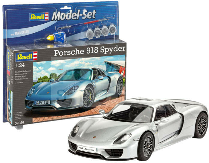 Revell Model Set Porsche 918 Spyder 1:24 autó makett 67026R Makett méretarány: 1:24 Alkatrész darabszám: 129 Makett hossúság: 19,4 cm Festést és ragasztást igénylő műanyag makett. A készlet az alap színeket (Revell Aqua Color), ragasztót illetve ecsetet tartalmaz . Gyártó: Revell A Revell tradicionális nagy múltú makett gyártó. Már több mint 60 éve kápráztatja el a rajo