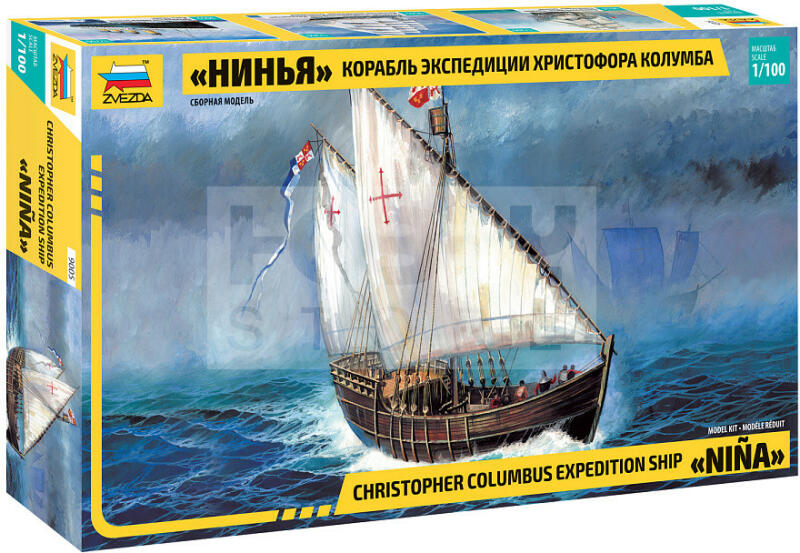 Zvezda Caravel 'Nina' makett 1:100 (9005Z) Makett méretarány: 1:100 Alkatrész darabszám: 186 Makett hosszúsága: 21 cm A Zvezda a kiváló műanyag modelljei kapcsán vált világszerte ismerté. Makettei a legnépszerűbb méretarányokban érhető el. Elsősorban 2. világháborús gépezetek és kiegészítőik kapcsán érdemes megemlíteni a nevét, de a történelmi makettekből is szé