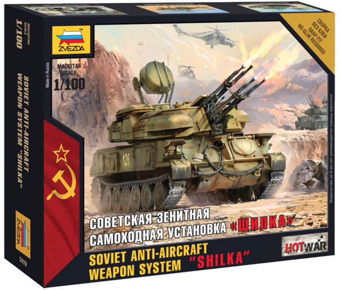 Snap modell Zvezda 7419 önjáró Shilka légvédelmi tank. 1: 100, hossza 6,7 cm. Kit tartalmaz 29 darab összetételét.