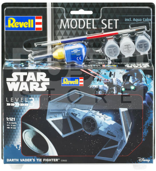 Revell Star Wars Model Set Darth Vader TIE vadászgépe 1:121 űrhajó makett 63602R Makett méretarány: 1:121 Alkatrész darabszám: 21 Makett hossúság: 7,1 cm Festést és ragasztást igénylő műanyag makett. A készlet az alap színeket (Revell Aqua Color), ragasztót illetve ecsetet tartalmaz . Gyártó: Revell A Revell tradicionális nagy múltú makett gyártó. Már több mint 60 éve