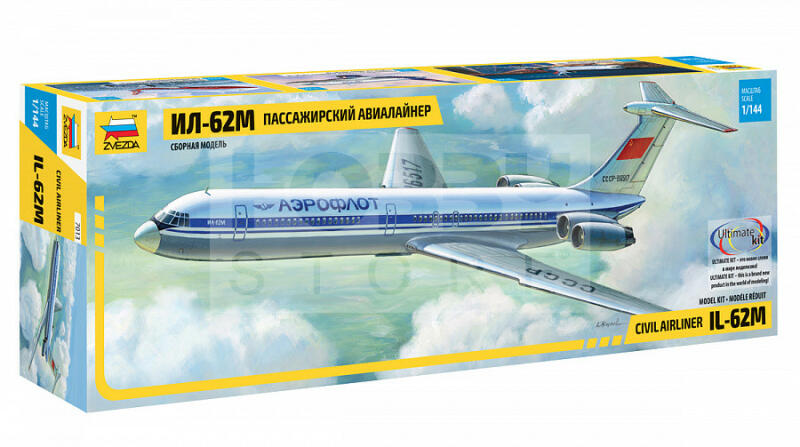 Zvezda Ilushin Il-62M makett 1:144 (7013Z) Makett méretarány: 1:144 Alkatrész darabszám: 139 Makett hosszúsága: 36,9 cm A Zvezda a kiváló műanyag modelljei kapcsán vált világszerte ismerté. Makettei a legnépszerűbb méretarányokban érhető el. Elsősorban 2. világháborús gépezetek és kiegészítőik kapcsán érdemes megemlíteni a nevét, de a történelmi makettekből is sz