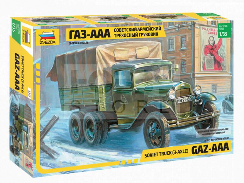 Zvezda GAZ-AAA Soviet Truck makett 1:35 (3547Z) Makett méretarány: 1:35 Alkatrész darabszám: 65 Makett hosszúsága: 14 cm A Zvezda a kiváló műanyag modelljei kapcsán vált világszerte ismerté. Makettei a legnépszerűbb méretarányokban érhető el. Elsősorban 2. világháborús gépezetek és kiegészítőik kapcsán érdemes megemlíteni a nevét, de a történelmi makettekből is s