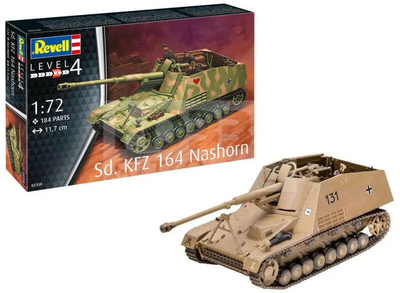Revell Sd. Kfz. 164 Nashorn 1:72 harcjármű makett 03358R Makett méretarány: 1:72 Alkatrész darabszám: 184 Makett hossúság: 11,7 cm Festést és ragasztást igénylő műanyag makett. A szükséges kiegészítőket, mint festék, ragasztó a készlet nem tartalmazza . Gyártó: Revell A Revell tradicionális nagy múltú makett gyártó. Már több mint 60 éve kápráztatja el a rajongóit