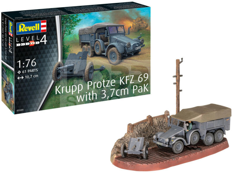 Revell Krupp Protze KFZ 69 with 3,7cm Pak 1:76 harcjármű makett 03344R Makett méretarány: 1:76 Alkatrész darabszám: 61 Makett hossúság: 10,7 cm Festést és ragasztást igénylő műanyag makett. A szükséges kiegészítőket, mint festék, ragasztó a készlet nem tartalmazza . Gyártó: Revell A Revell tradicionális nagy múltú makett gyártó. Már több mint 60 éve kápráztatja el