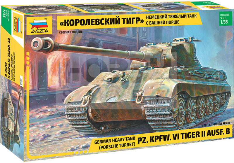 Zvezda PZ. KPFW. VI TIGER II. AUSF. B. makett 1:35 (3616Z) Makett méretarány: 1:35 Alkatrész darabszám: 487 Makett hosszúsága: 30 cm A Zvezda a kiváló műanyag modelljei kapcsán vált világszerte ismerté. Makettei a legnépszerűbb méretarányokban érhető el. Elsősorban 2. világháborús gépezetek és kiegészítőik kapcsán érdemes megemlíteni a nevét, de a történelmi maket