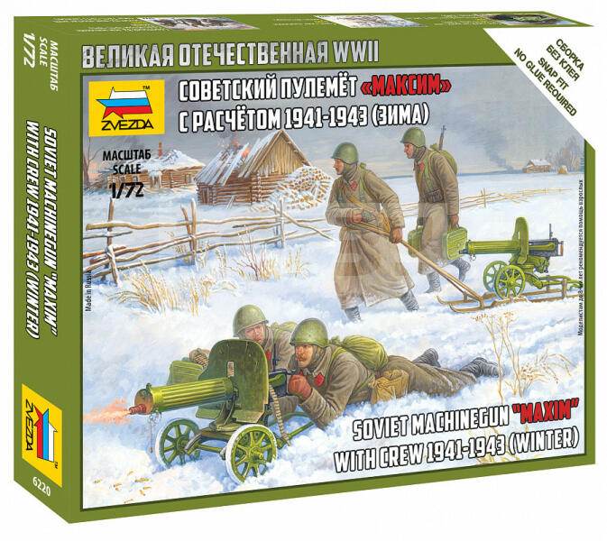 Zvezda Soviet Machine-gun w/Crew makett 1:72 (6220Z) Makett méretarány: 1:72 Alkatrész darabszám: 30 Makett hosszúsága: 2,4 cm A Zvezda a kiváló műanyag modelljei kapcsán vált világszerte ismerté. Makettei a legnépszerűbb méretarányokban érhető el. Elsősorban 2. világháborús gépezetek és kiegészítőik kapcsán érdemes megemlíteni a nevét, de a történelmi makettekbő
