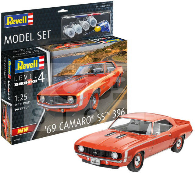 Revell Model Set 69 Camaro SS 1:25 autó makett 67712R Makett méretarány: 1:25 Alkatrész darabszám: 93 Makett hossúság: 18,9 cm Festést és ragasztást igénylő műanyag makett. A készlet az alap színeket (Revell Aqua Color), ragasztót illetve ecsetet tartalmaz . Gyártó: Revell A Revell tradicionális nagy múltú makett gyártó. Már több mint 60 éve kápráztatja el a rajongóit