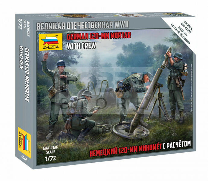 Zvezda - German 120mm Mortar w/Crew makett 1:72 (6268Z) Makett méretarány: 1:72 Alkatrész darabszám: 29 Makett hosszúsága: 2,4 cm A Zvezda a kiváló műanyag modelljei kapcsán vált világszerte ismerté. Makettei a legnépszerűbb méretarányokban érhető el. Elsősorban 2. világháborús gépezetek és kiegészítőik kapcsán érdemes megemlíteni a nevét, de a történelmi makettek