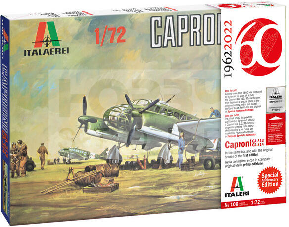 Italeri Caproni Ca. 313/314 Vintage Special Anniversary Edition 1:72 repülőgép makett 0106IT Makett méretarány: 1:72 Az Italeri makett gyártó cég több mint 60 éve kápráztatja el a makettezni vágyókat műanyag termékeikkel. Történelmi maketteik megalkotását pontos kutatási munkák előzik meg, így válhattak ennyire népszerűvé. Ugyanakkor széles termékpaletta jellemzi őke
