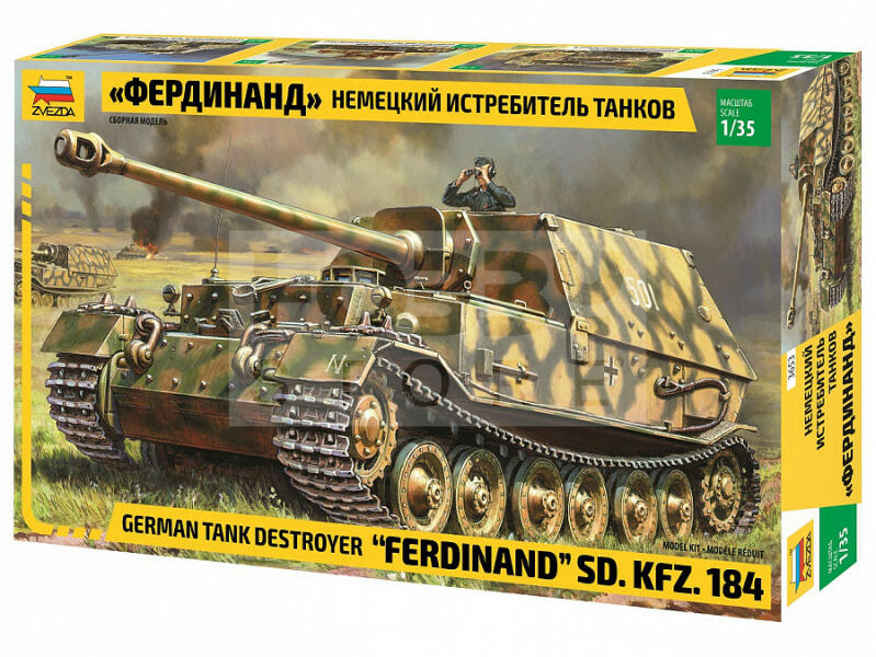 Zvezda Sd. Kfz. 184 Ferdinand Tiger makett 1:35 (3653Z) Makett méretarány: 1:35 Alkatrész darabszám: 292 Makett hosszúsága: 23 cm A készlet az építéshez szükséges makett ragasztót, ecsetet és makett festéket nem tartlmazza. A Zvezda a kiváló műanyag modelljei kapcsán vált világszerte ismerté. Makettei a legnépszerűbb méretarányokban érhető el. Elsősorban 2. világhábo