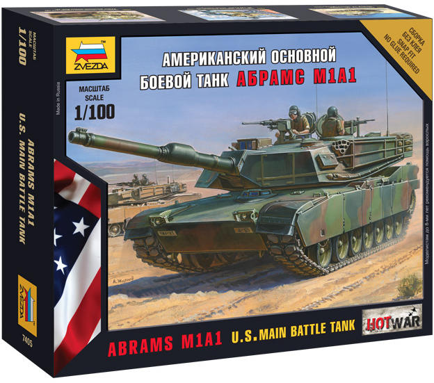 Snap modell Zvezda 7405 M1 Abrams harckocsi A1. 1: 100, hossza 9,8 cm. Kit tartalma: 12 db készítmény.