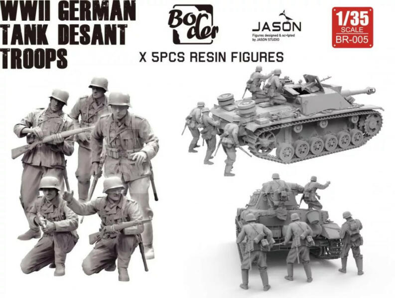 Border Model WW2 German Tank Desant Troops makett 1:35 (BR005) Makett méretarány: 1:35 A Border Model neve részletes műanyag modelleik kapcsán vált híressé. Jó minősége és részletgazdag kidolozottsága miatt népszerű a makettezők körében. Főleg katonai harcjárművek és repülők találhatóak meg kínálatukban. Könnyű összeszerelhetősége által jó választás lehet kezd