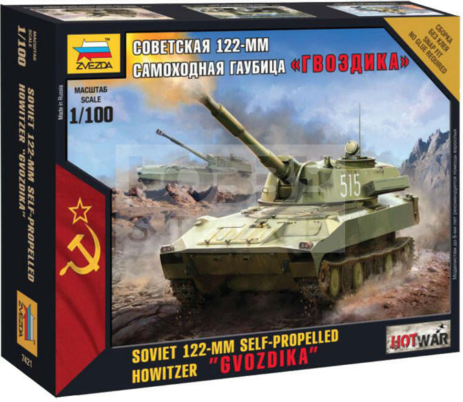 Zvezda 122-mm Gvozdika makett 1:100 (7421Z) Makett méretarány: 1:100 Alkatrész darabszám: 19 Makett hosszúsága: 7,4 cm A Zvezda a kiváló műanyag modelljei kapcsán vált világszerte ismerté. Makettei a legnépszerűbb méretarányokban érhető el. Elsősorban 2. világháborús gépezetek és kiegészítőik kapcsán érdemes megemlíteni a nevét, de a történelmi makettekből is sz