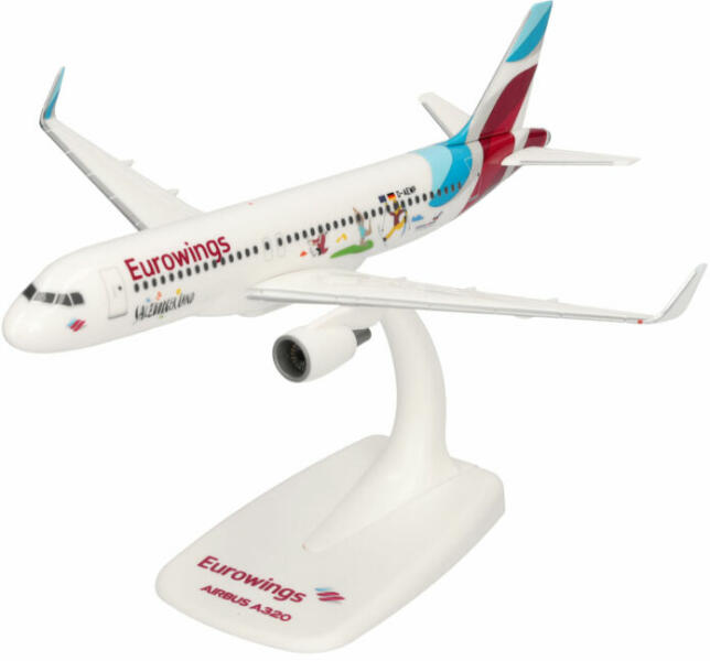 Airbus A320 Eurowingsrepülőgép modell. (Herpa Snap-fit)Kiváló minőségű műanyag (PPC) repülőgépmodell, melynek alkatrészei ragasztás nélkül illeszthető egymáshoz. Modern nyomdai nyomtatási technológiával gyártva. A modell tartó állvánnyal rendelkezik, futóművek nincsenek. Anyaga: műanyagMérete: 18,8 cmModelljeink épségét a szállítás előtt ellenőrizzük, majd a d