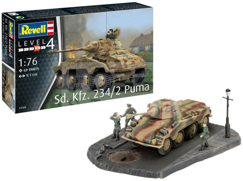 Revell Sd. Kfz. 234/2 Puma 1:76 harcjármű makett 03288R Makett méretarány: 1:76 Alkatrész darabszám: 69 Makett hossúság: 9,1 cm Festést és ragasztást igénylő műanyag makett. A szükséges kiegészítőket, mint festék, ragasztó a készlet nem tartalmazza . Gyártó: Revell A Revell tradicionális nagy múltú makett gyártó. Már több mint 60 éve kápráztatja el a rajongóit te