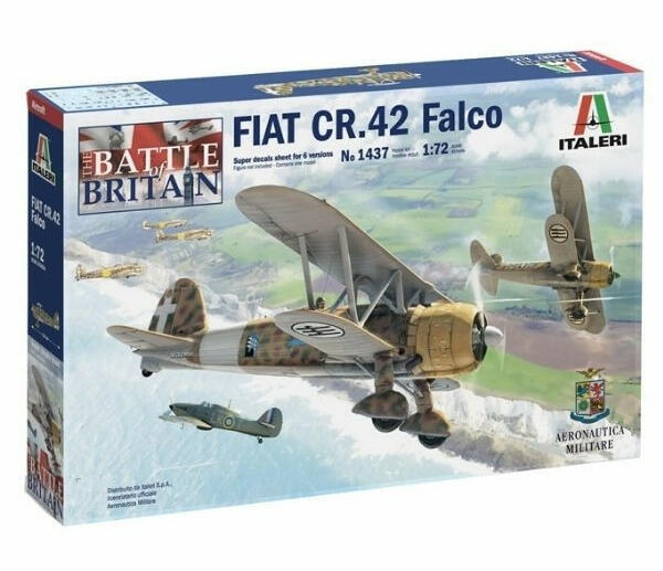 1:72 méretarányú FIAT CR 42 Falco repülőgép makett. Második világháborús olasz repülőgép . Először 1936-ban repült, majd 1939-től hadrendbe állt az olasz légierőnél. A CR32 utódja amit továbbfejlesztettek a sikeres spanyolországi bevetése után. Mivel túl lassú és gyenge fegyverzettel volt ellátva ezért inkább az észak-afrikai hadszíntéren vetették be. Fegyverzet