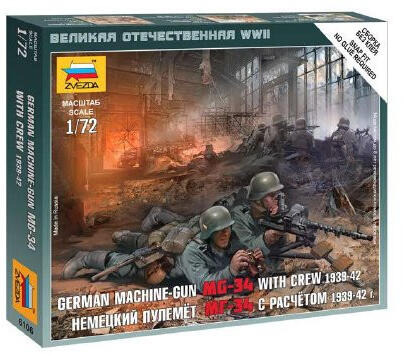 Festést igénylő makett. A doboz 4db festetlen öntött műanyag katonát és 2db géppuskát tartalmaz. Gyártó: Zvezda