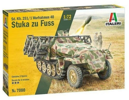 1:72 méretarányú Sd. Kfz. 251/1 Stuka zu Fuss katonai jármű makett. Az Sd. Kfz. 251 széles körben alkalmazott II. világháborús német lövészpáncélos. Fél hernyótalpas megoldása miatt nehezebb terepen is jobban boldogult. Lövészkatonák szállítása mellett vontatásra is használták. Sokféle változatban épült. Különféle légvédelmi fegyvereket is szereltek rá, 20 mm-e