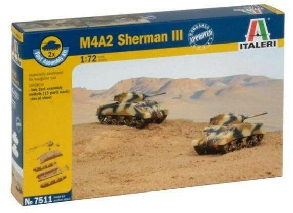 1:72 méretarányú M4A2 Sherman III karckocsi makett. Az M4 Sherman a második világháború amerikai nehézsúlyú médiuma volt. Az első prototípusok 1941-ben készültek, a sorozatgyártás 1942-1945 között folytatódott. Összesen mintegy 49.000 példány készült ebből a harckocsiból az összes változatból, ami a második világháború egyik legtöbbet gyártott tankjává és a s
