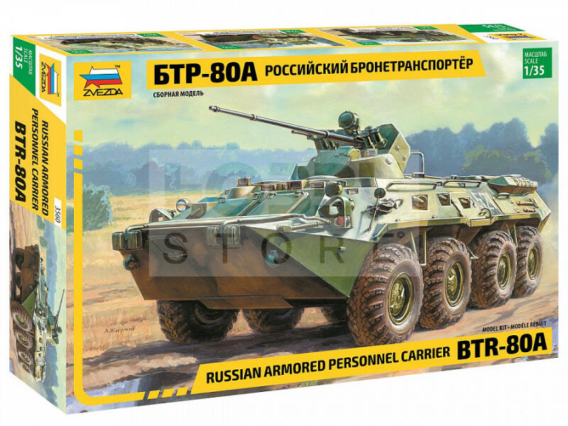 Zvezda BTR-80A Russian Personnel Carrier makett 1:35 (3560z) Makett méretarány: 1:35 Alkatrész darabszám: 231 Makett hosszúsága: 21 cm A Zvezda a kiváló műanyag modelljei kapcsán vált világszerte ismerté. Makettei a legnépszerűbb méretarányokban érhető el. Elsősorban 2. világháborús gépezetek és kiegészítőik kapcsán érdemes megemlíteni a nevét, de a történelmi mak