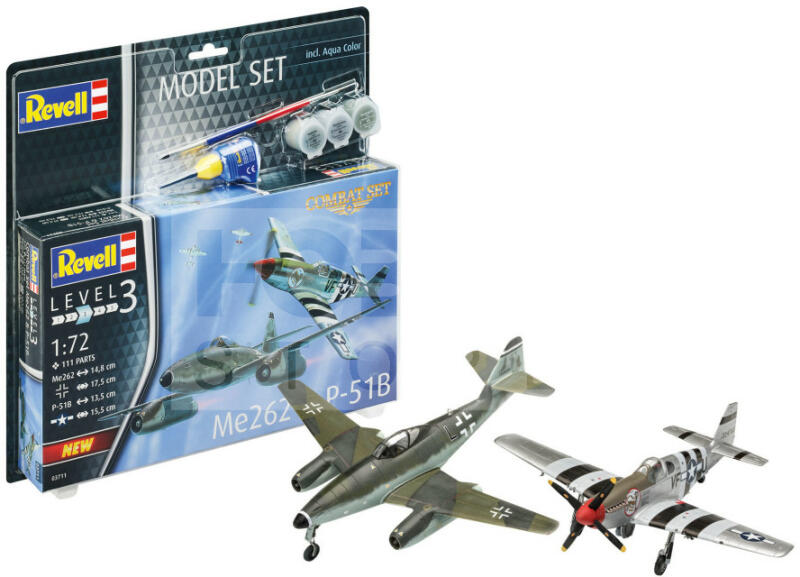 Revell Gift Set Combat Set Me262 & P-51B 1:72 repülőgép makett 63711R Makett méretarány: 1:72 Alkatrészek száma: 111 Festést és ragasztást igénylő műanyag makett. A készlet az alap színeket (Revell Aqua Color), ragasztót illetve ecsetet tartalmaz . Gyártó: Revell A Revell tradicionális nagy múltú makett gyártó. Már több mint 60 éve kápráztatja el a rajongóit termé