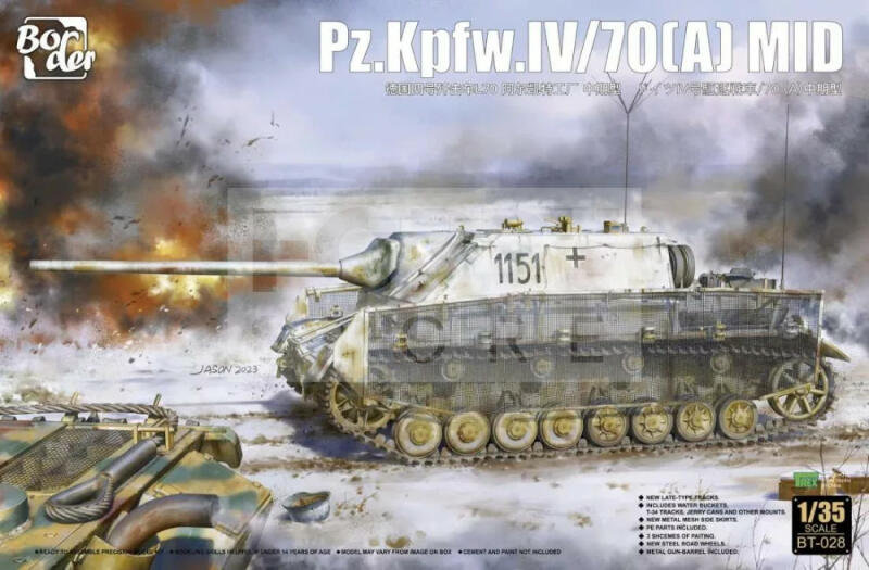 Border Model Pz. Kpfw. IV/70 (A) mid makett 1:35 (BT028) Makett méretarány: 1:35 A Border Model neve részletes műanyag modelleik kapcsán vált híressé. Jó minősége és részletgazdag kidolozottsága miatt népszerű a makettezők körében. Főleg katonai harcjárművek és repülők találhatóak meg kínálatukban. Könnyű összeszerelhetősége által jó választás lehet kezdő mod