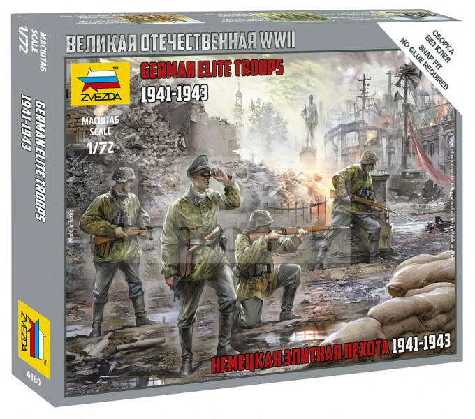 Zvezda German Elite Troops 1939-43 makett 1:72 (6180Z) Makett méretarány: 1:72 Alkatrész darabszám: 25 Makett hosszúsága: 2,4 cm A Zvezda a kiváló műanyag modelljei kapcsán vált világszerte ismerté. Makettei a legnépszerűbb méretarányokban érhető el. Elsősorban 2. világháborús gépezetek és kiegészítőik kapcsán érdemes megemlíteni a nevét, de a történelmi makettekb