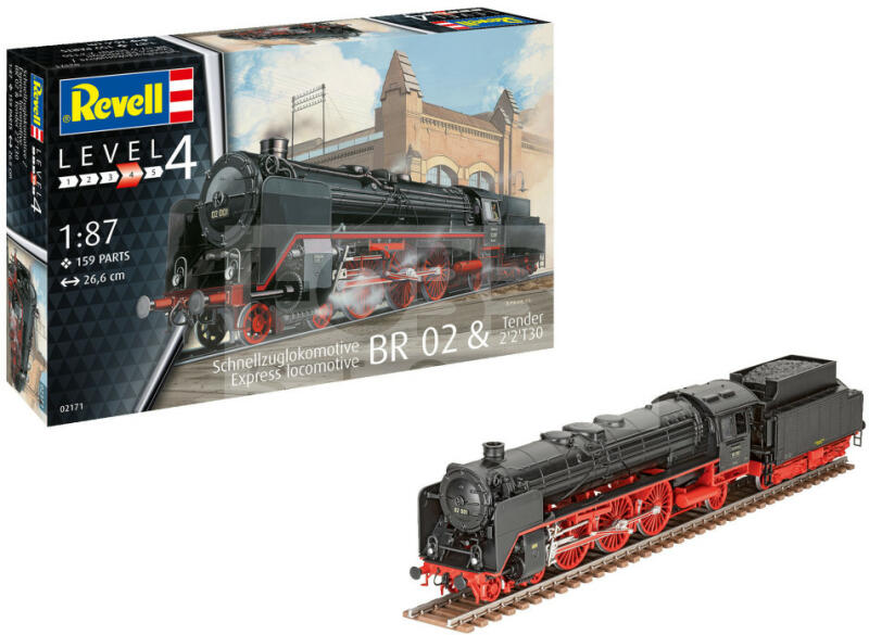 Revell - Express locomotive BR 02 & Tender 2'2'T30 1:87 mozdony makett 02171R Makett méretarány: 1:87 Alkatrész darabszám: 159 Makett hossúság: 26,6 cm Festést és ragasztást igénylő műanyag makett. A szükséges kiegészítőket, mint festék, ragasztó a készlet nem tartalmazza . Gyártó: Revell A Revell tradicionális nagy múltú makett gyártó. Már több mint 60 éve kápr