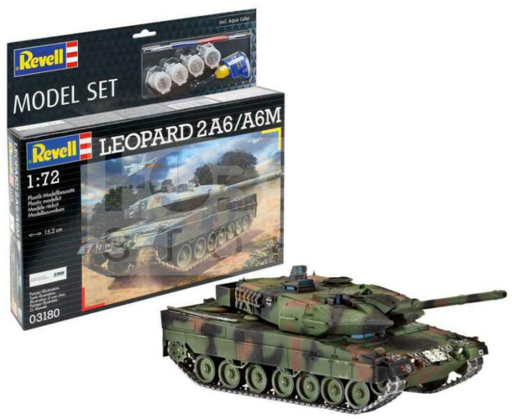 Revell Gift Set Leopard 2A6/A6M 1:72 harcjármű makett 63180R Makett méretarány: 1:72 Alkatrész darabszám: 168 Makett hossúság: 15,2 cm Festést és ragasztást igénylő műanyag makett. A készlet az alap színeket (Revell Aqua Color), ragasztót illetve ecsetet tartalmaz . Gyártó: Revell A Revell tradicionális nagy múltú makett gyártó. Már több mint 60 éve kápráztatja el a ra