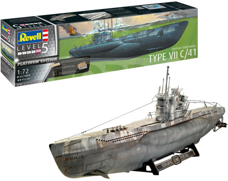 Revell German Submarine Type VII C/41 1:72 tengeralattjáró makett 05163R Makett méretarány: 1:72 Alkatrész darabszám: 832 Makett hossúság: 93,4 cm Festést és ragasztást igénylő műanyag makett. A szükséges kiegészítőket, mint festék, ragasztó a készlet nem tartalmazza . Gyártó: Revell A Revell tradicionális nagy múltú makett gyártó. Már több mint 60 éve kápráztatja
