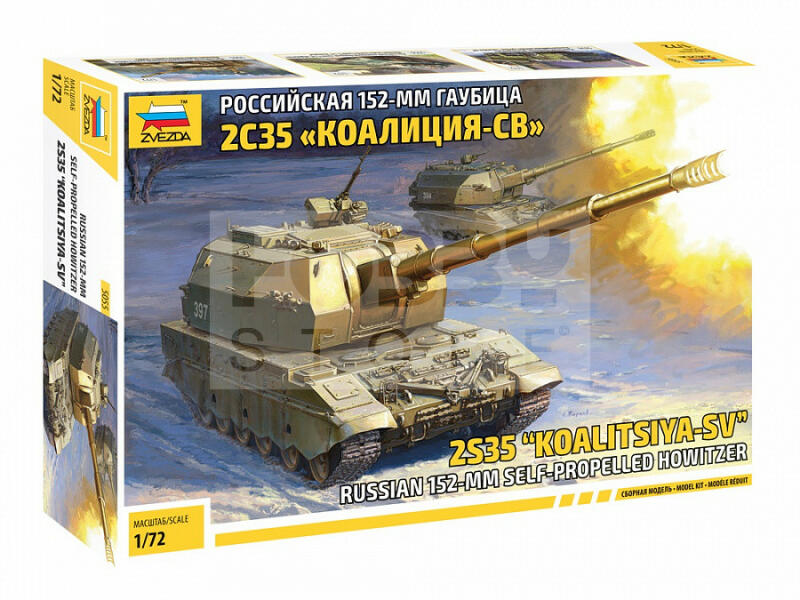 Zvezda "Koalitsya-SV" Self Propelled Howitzer makett 1:72 (5055Z) Makett méretarány: 1:72 Alkatrész darabszám: 171 Makett hosszúsága: 19,4 cm A Zvezda a kiváló műanyag modelljei kapcsán vált világszerte ismerté. Makettei a legnépszerűbb méretarányokban érhető el. Elsősorban 2. világháborús gépezetek és kiegészítőik kapcsán érdemes megemlíteni a nevét, de a történe